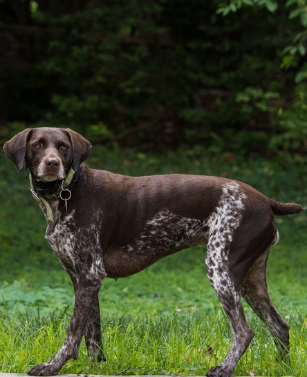 German Shorthaired Pointer, due to his versatile hunting qualities, is popular not only at home in Germany. This breed of dogs can be found absolutely in any country of the world, including the USA. The GSPs were bred as any game hunters. They are able to hunt under any conditions and on any game. They feel better in open spaces than in the forest. But they can adapt, and not only to hunting conditions, but also to prey. German Shorthaired Pointers can change the style of hunting, depending on what game they hunt. The dogs are especially good in hunting birds, on land and water. Their coat is tough and tight to the body, and therefore has excellent water-resistant features. The membranes on the paw allow to swim quickly and for a long time. And long claws allow to run on any surface, even over the mountains.